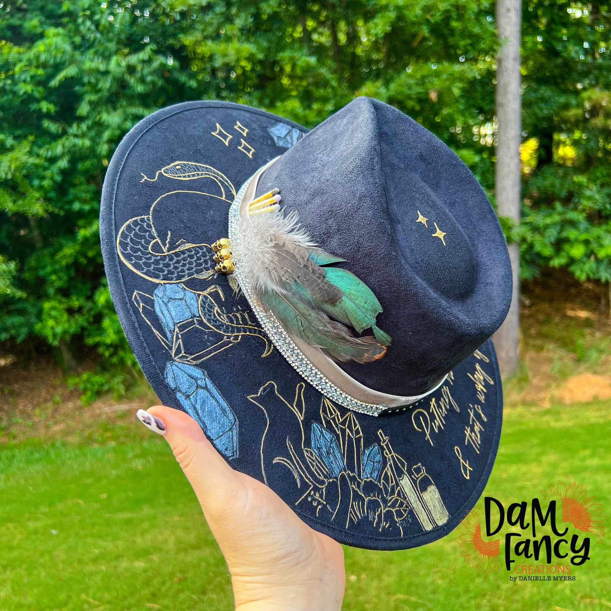 Faux suede, wide brim hat hand painted and burned by me. All designs are sealed and sprayed with scotch guard to protect them incase they get wet.
