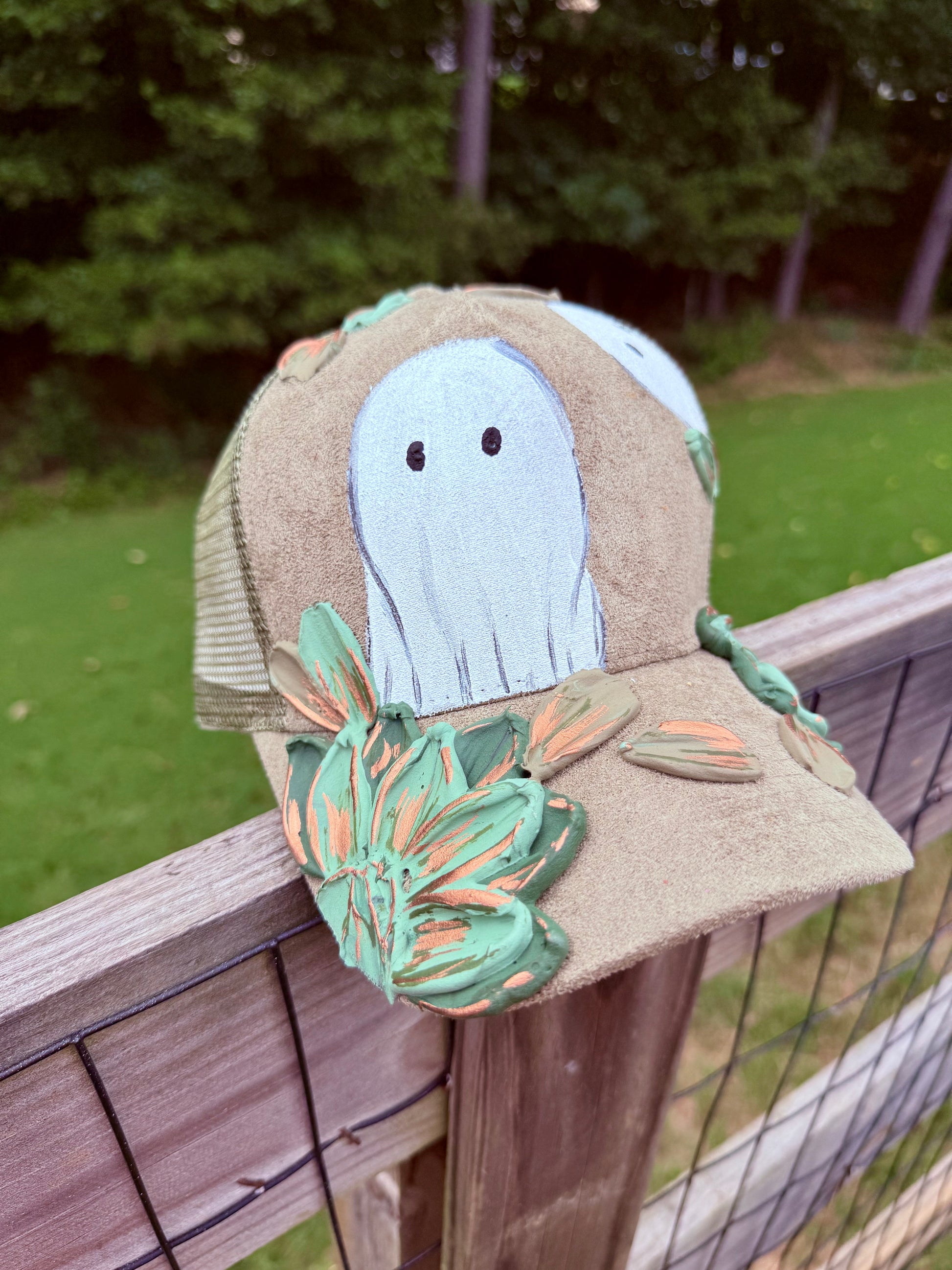 Olive base with hand painted ghost and 3D flowers. The 3D texture is extremely durable and dries flexible and waterproof!