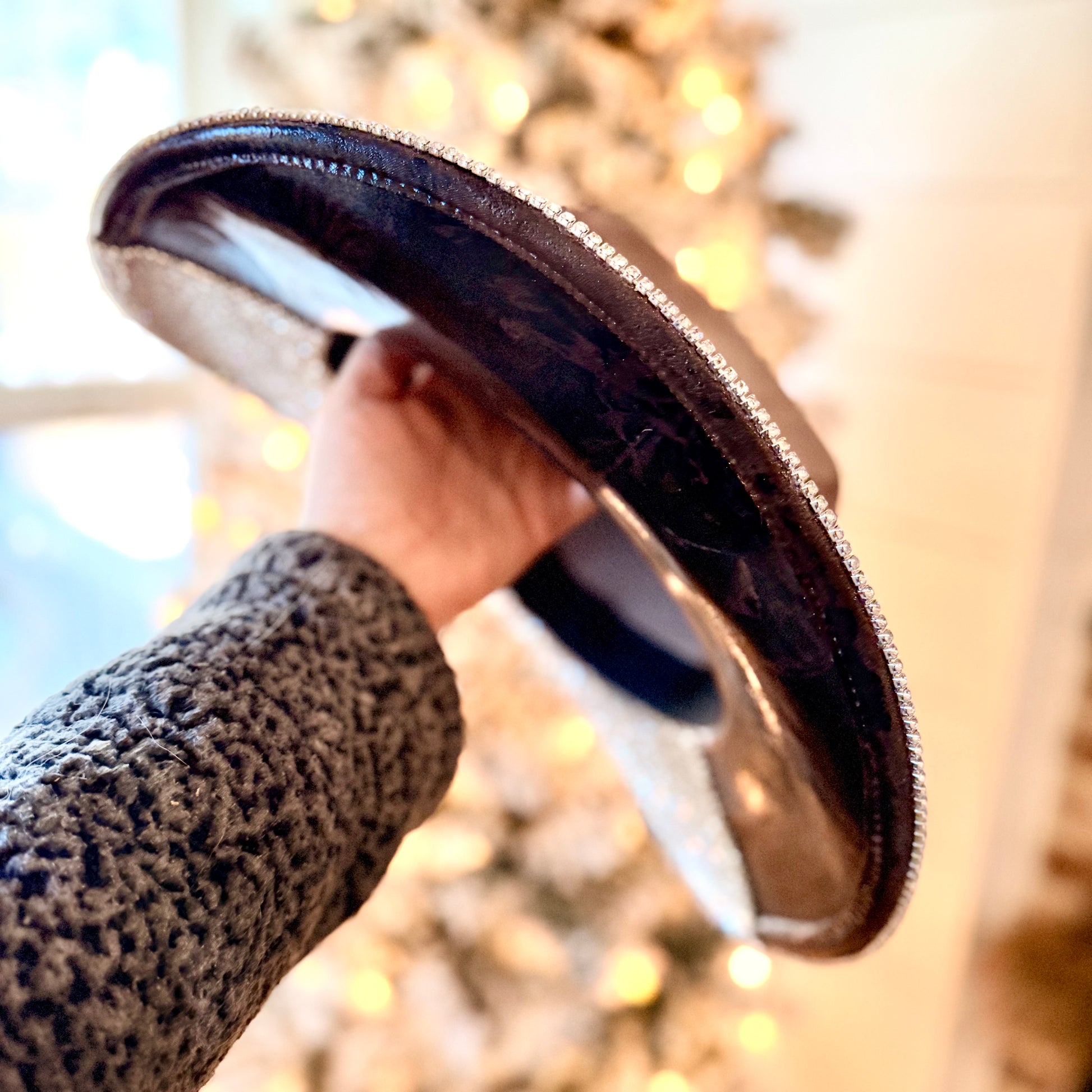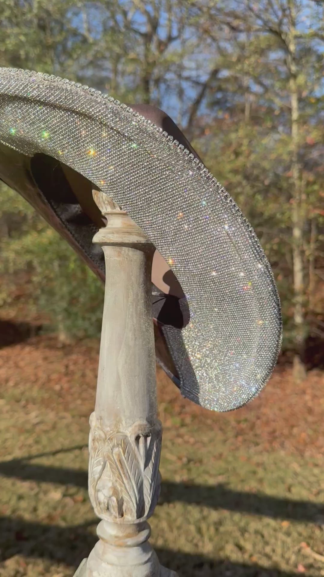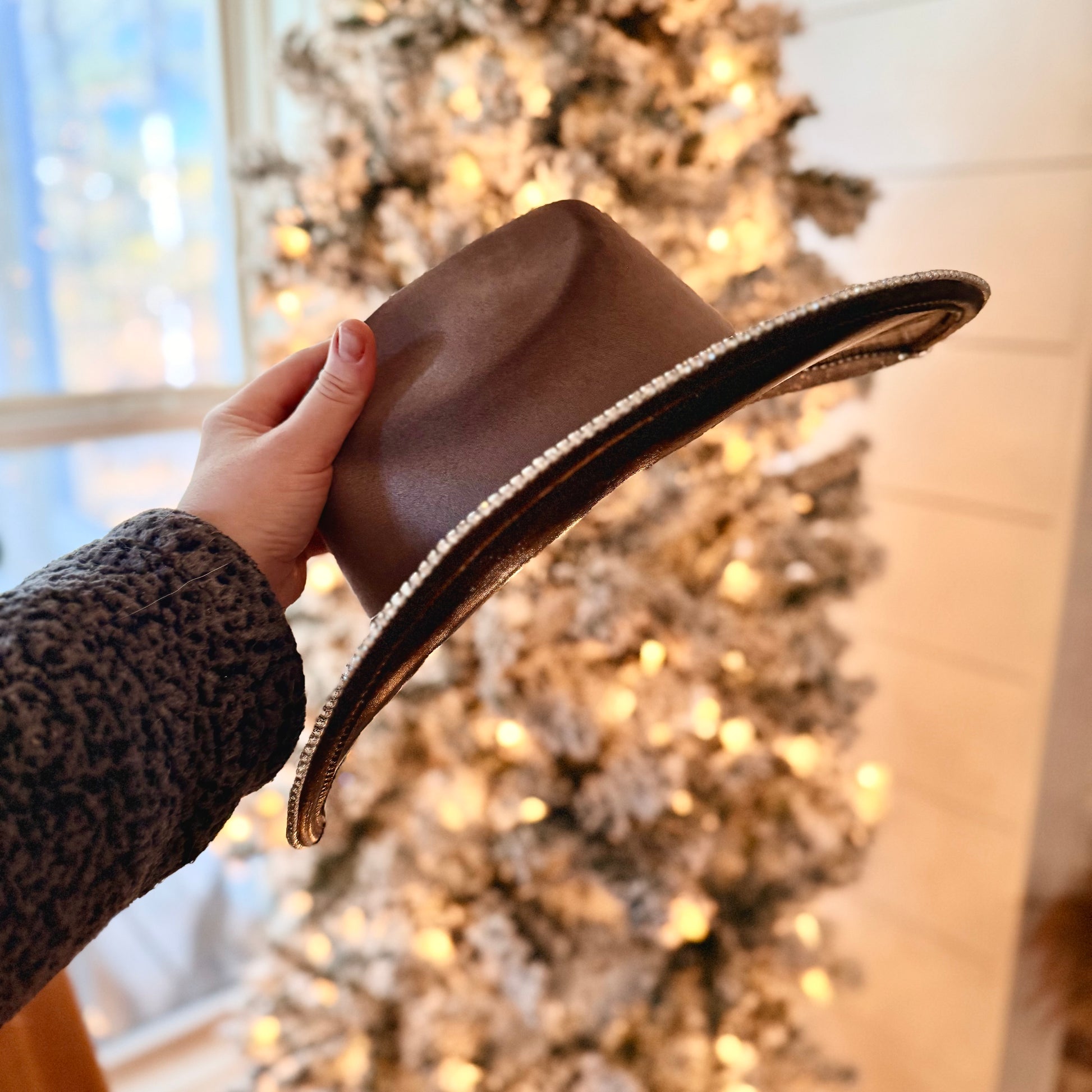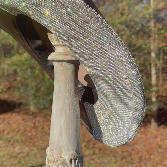 One side of the under-brim is finished with high-quality glass rhinestones, chosen for their intense sparkle and durability. The opposite side features a distressed metallic foil transfer, adding depth, shine, and texture. To complete the look, a glass rhinestone chain is secured around the perimeter of the brim for extra brilliance.
