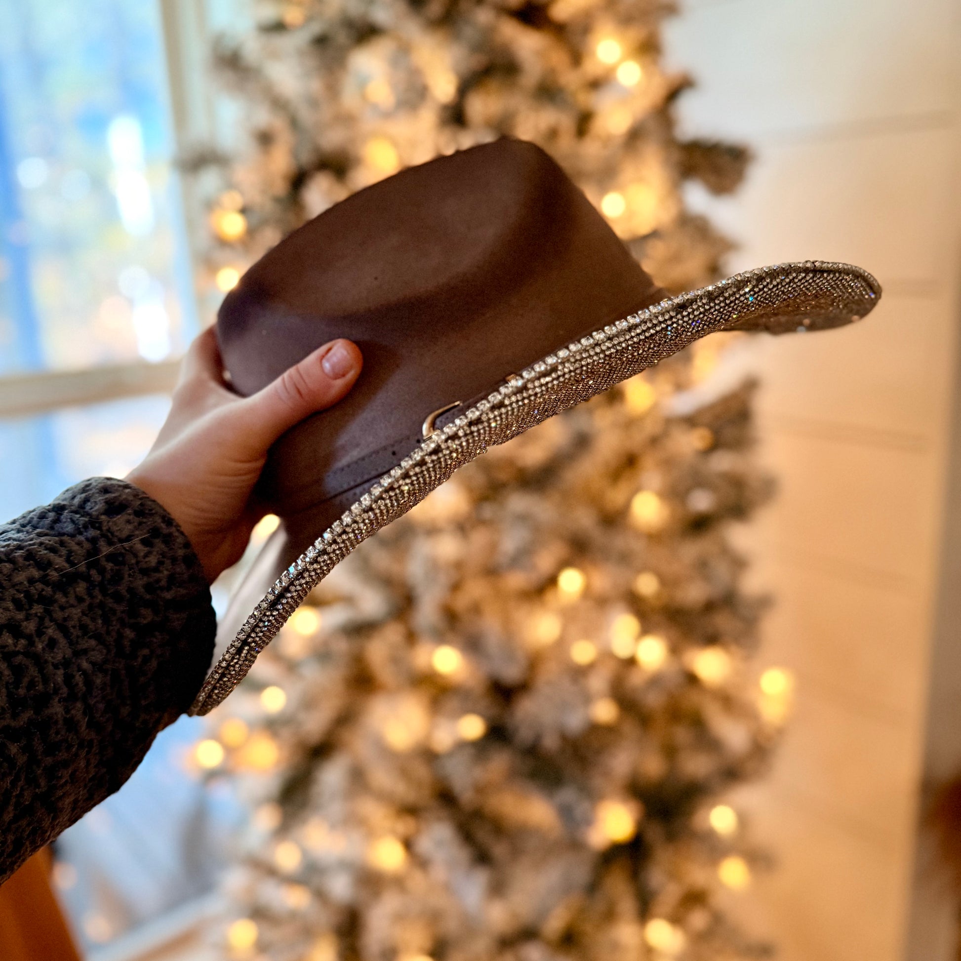 The perfect mix of rustic and sparkles is here! This high-end, one-of-a-kind wide brim hat features a fully customized luxury under-brim design, created with premium materials. Designed to sparkle with each movement, this piece makes a statement from every angle.