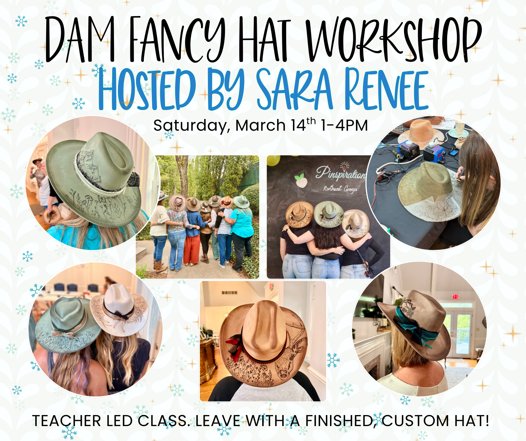 This hands-on workshop allows you to design and create a personalized hat using the art of burning. Attendees will select between a Teardrop wide-brim or Cattleman style hat, pick their color, and grab their chosen template from me to burn onto their hat. The class will be led by me, I will walk you through every step!